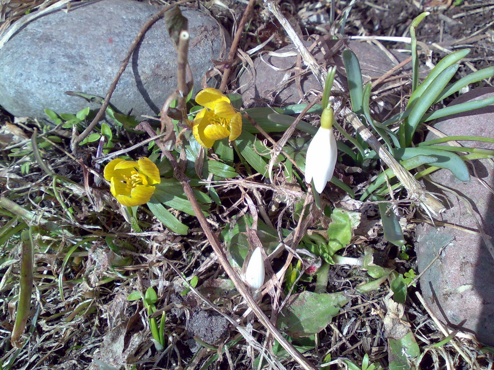 Men vintergäck och snödroppar blommar i rabatterna. Igår upptäckte jag att rådjuren ätit upp alla tulpanknoppar, i natt har de varit på återbesök och tuggat allt slätt med marken, åtminstone 20-30 tulpanlökar. De har det svårt just nu stackrarna, men jag tycker ändå de kunde ge tusan i mina blommor. Enda som hjälper är bössa eller hund, i så fall blir det hund. Men just nu räcker det med fyra katter och fem kattungar i huset...